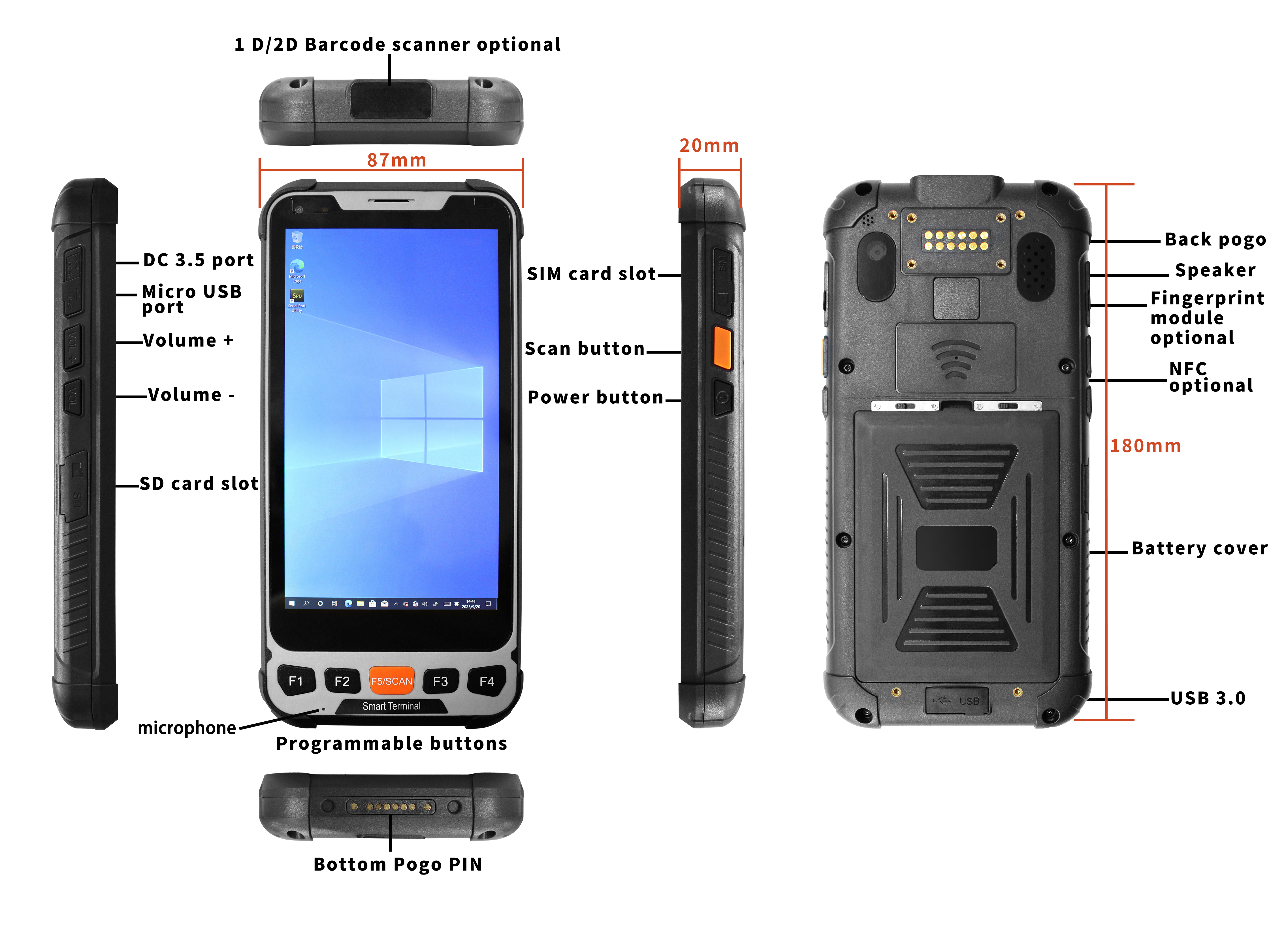 | Button | V+ -, Power, Barcode Scan*2 Customized Button: F1,F2,F3,F4 |