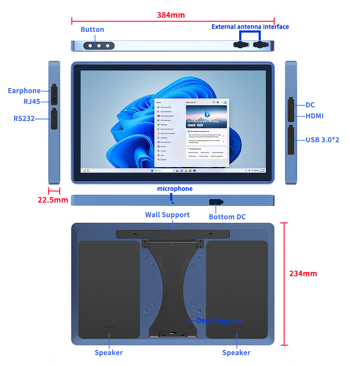 Doble interfaz de alimentación DC 12V 3A ∮4,0mm ×2; HDMI Type A ×1; USB Type-A 3.2 Gen1 ×2 USB Type-C 3.2 Gen1 ×1 (carga PD, salida de video DP, transferencia de datos, carga); Jack de auriculares ∮3,5mm ×1 Ethernet Gigabit (RJ45); RS232 (conector DB9 estándar) |