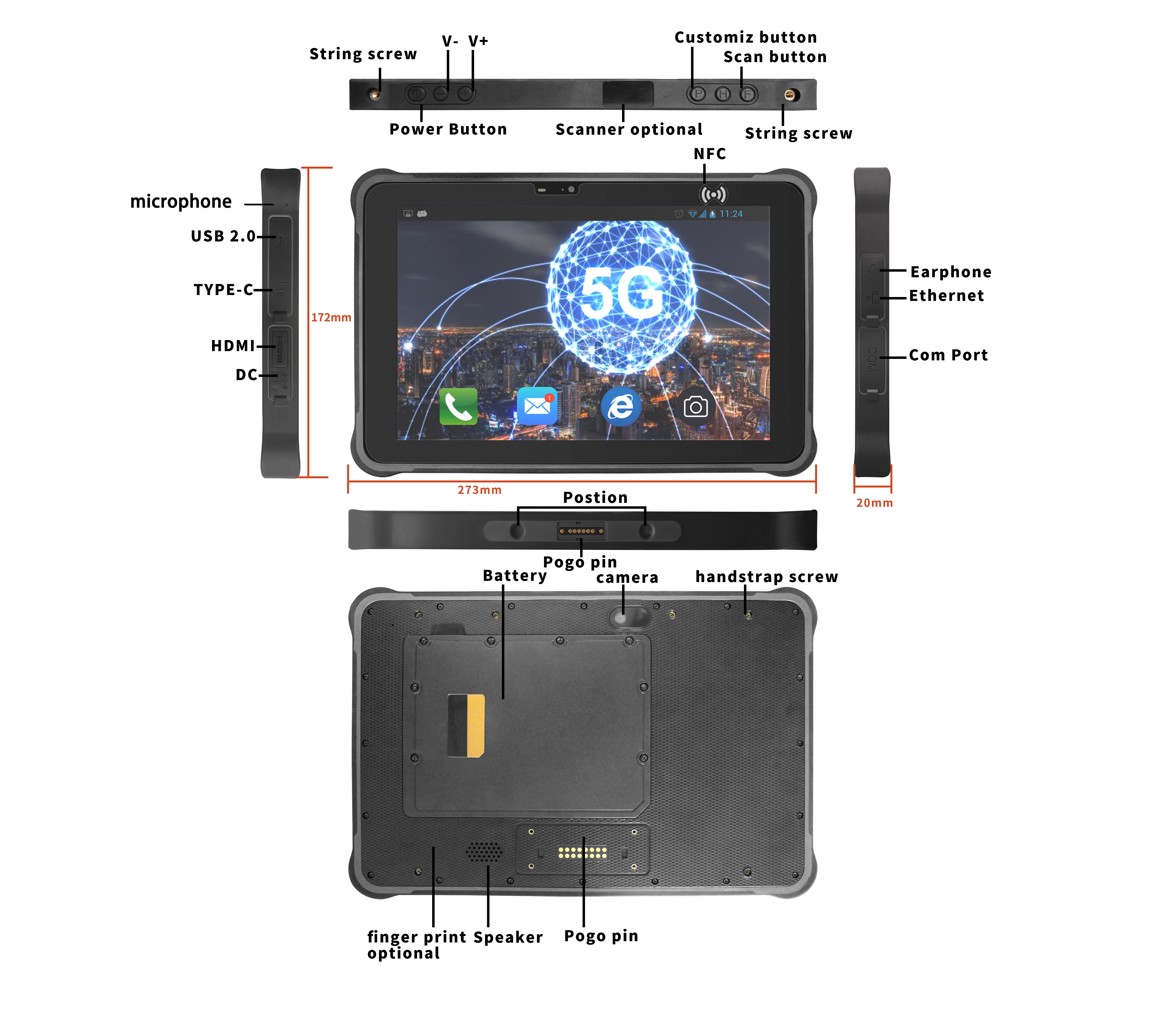 | Puertos de entrada/salida | Type-C ×1 (OTG); Ranura SIM×1; Ranura tarjeta TF×1; Jack auriculares×1; Jack DC×1 (3,5×12mm); USB 2,0 ×1; RJ45×1; RS232×1 Pogopin inferior: USB 2,0; Carga; RS232 Pogopin trasero: USB 2,0; RS232 |