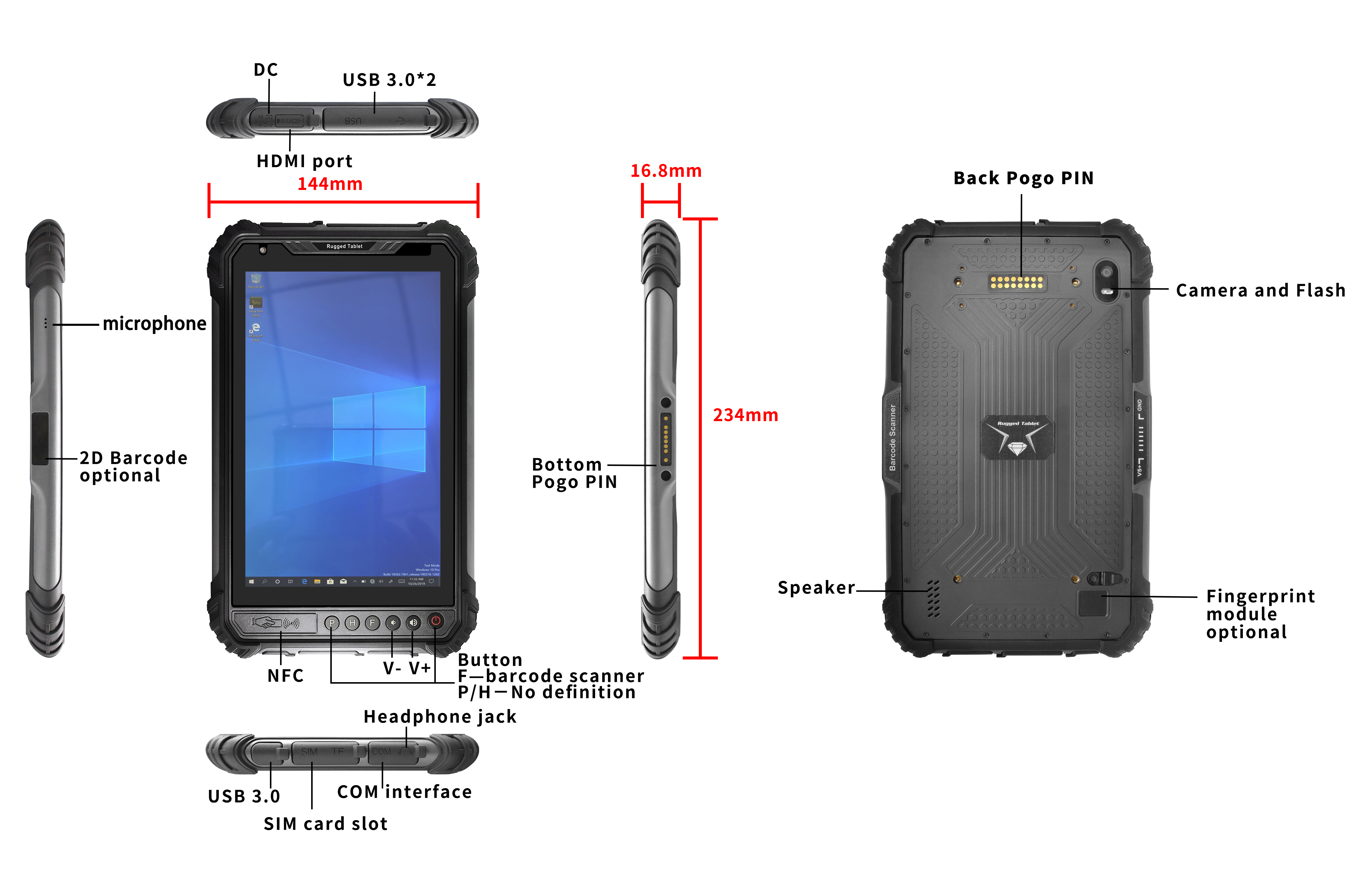 HDMI×1, Ranura para tarjeta SIM×1, RS232×1 (mini-USB), Jack para auriculares×1, Jack de alimentación CC×1 (4,0×15 mm), USB 3.0 ×3 Pogopin inferior: USB 2.0; Carga; RS232 Pogopin trasero: USB 2.0; RS232 |