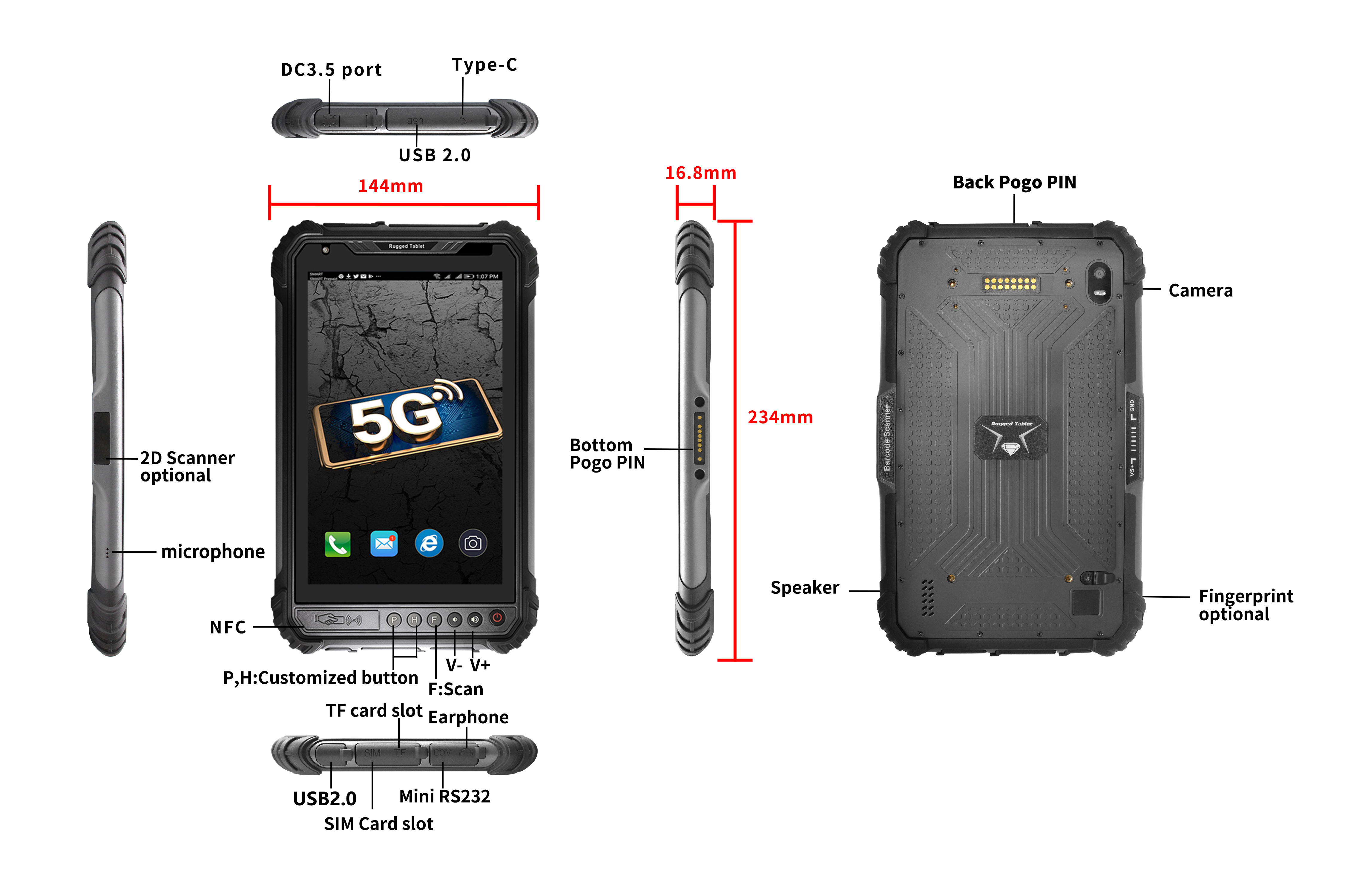 Tabletas industriales resistentes 5G: para logística, aplicación de la ley. Android, octa-core, gran memoria, rendimiento suave. Pantalla de alto brillo de 10 pulgadas, conectividad múltiple, GPS, cámaras duales. Protección IP65, resistencia a caídas / temperaturas generales. Ampliable, confiable.