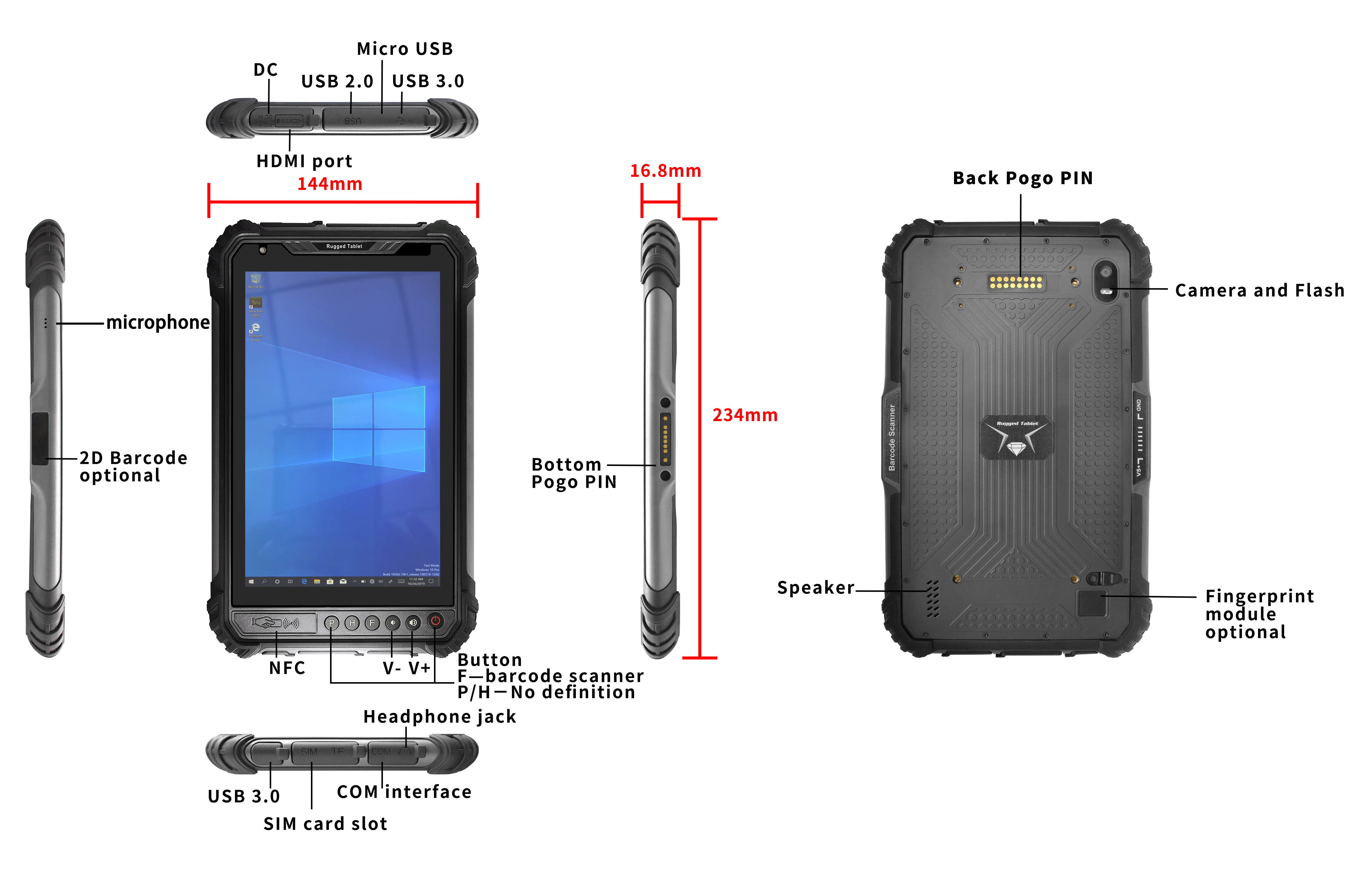 Salida HDMI×1, Ranura para tarjeta SIM×1, Puerto RS232×1 (mini-USB), Jack de auriculares×1, Puerto DC×1 (3,5×15 mm), USB-A: USB 3.0 ×2 + USB 2.0×1 Pogopins inferiores: USB 2.0; Carga; RS232 Pogopins traseros: USB 2.0; RS232 |
